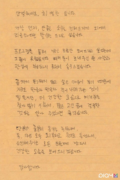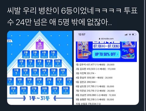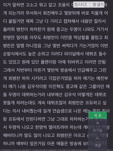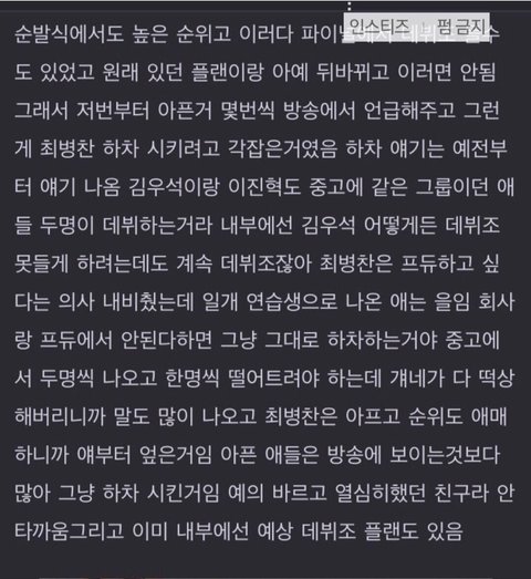 소감 발표 할 때 건강 빨리 회복하라는 얘기 말고 있어야 하지만 없는 병찬이 라고 말한 거.. 물론 병찬이 발 많이 아픈 것도 맞고 그 상태로는 무리였을 것도 맞긴한데 6등(베네핏 포함 9등)까지 한 애가 며칠 남긴 상황에서 하차라는 게 회사 의견이 들어갔다고로 밖에 안 보임 그렇게 입에 데뷔 달고 살던 애가 자진하차라니 온전히 자기 의사일 리가 없음 진짜로 전혀