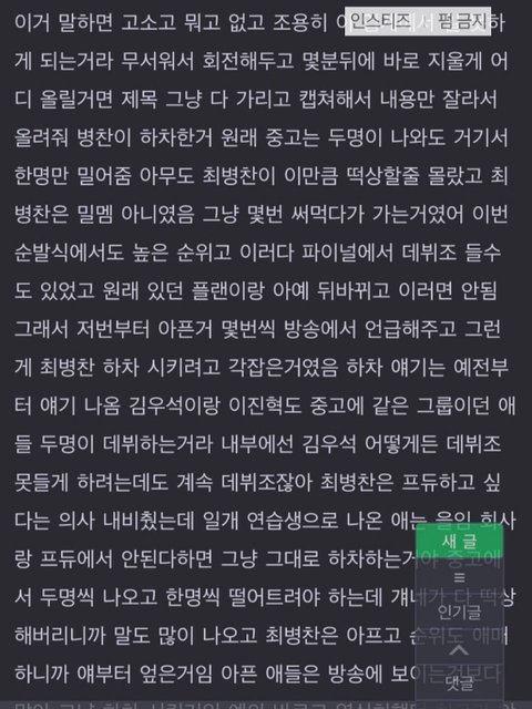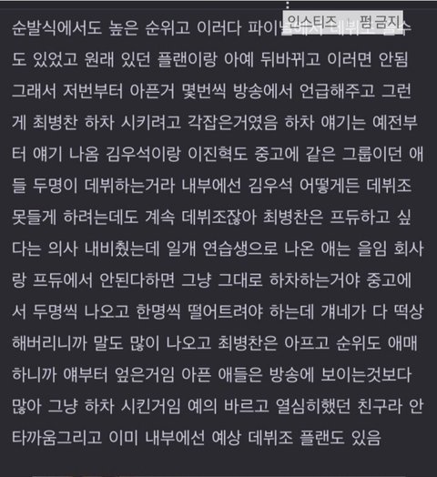 자진하차 기사 떴을 때부터 의심 들긴 했는데 오늘 프듀 보고 ㄹㅇ 확실해졌음