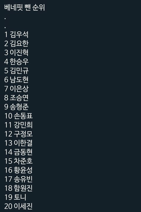 병찬이 있었으면 투픽 엄청 높았어서 5위안에는 들었을거 같은데 순위마저 안알려줘서 너무 슬펐다