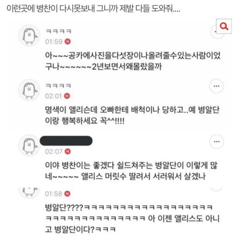 병찬이가 공카 와서 병알단들이라고 하자마자 이런 댓글 쓰는 게 팬 맞냐? 앨리스고 뭐고 맨날 떨어져서 다시 빅톤 들어오라고 염불 외운 것밖에 안한 것들이 돌아오니까 또 지들 안 챙긴다고 난리ㅋㅋㅋㅋㅋ 진짜 너무 한다는 생각 안들어? 여태 우리 애 이딴 취급 받으면서 그룹에 있었다고 생각하니까 손 떨리고 눈물 나올 것 같아..
