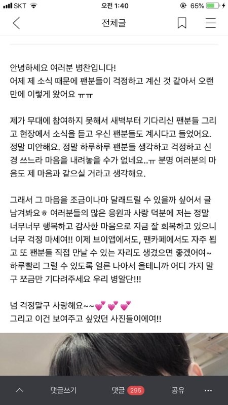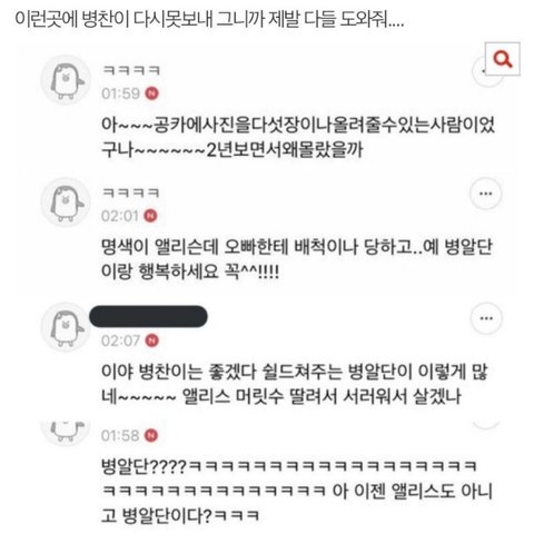 씨.발 진짜 왜저러냐고;; 제발 좀 도와줘 우리 병찬이 저렇게 빅톤 못보내. 또 앨리스들이 애 자존감 낮추고 나쁜말할거 생각하면 진짜 나 병찬이 못보낸다고ㅠㅠ