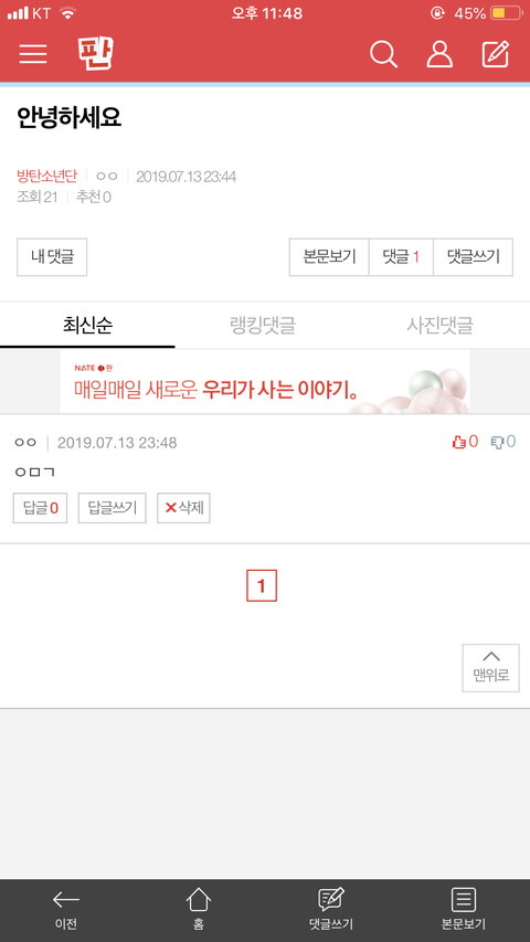 밑 안녕하세요 글,댓여기서봐