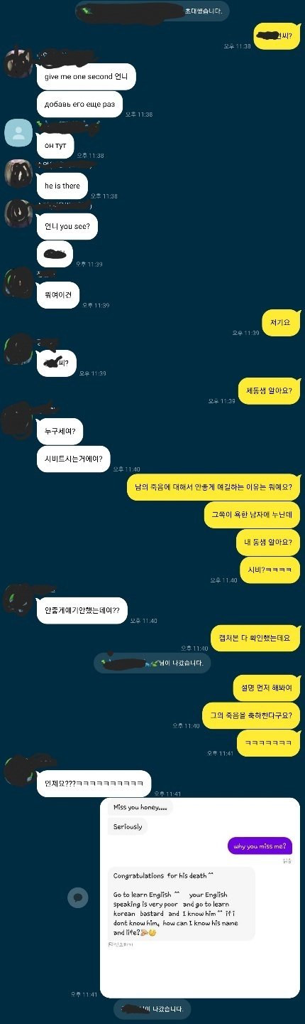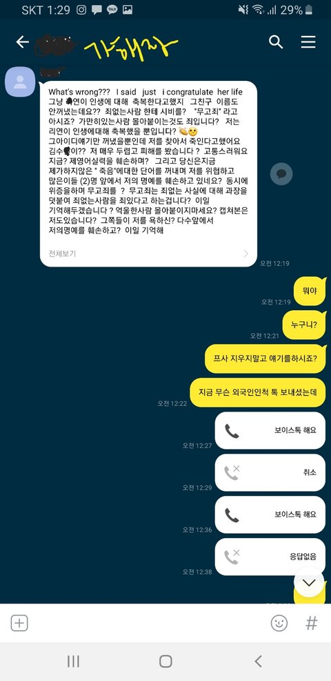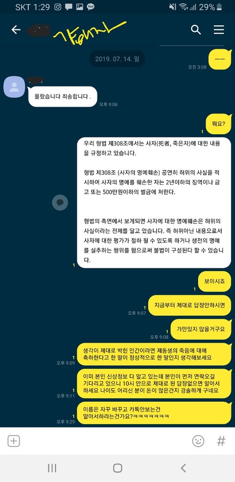 제 동생의 죽음을 축하한다고 말한 그 친구와 단톡방을 파달라고 하여 왜 그랬냐고 하니 발뺌을 하면서 저에게 시비트는거냐고 말하길래캡쳐되있던 증거를 보냈더니 바로 방을 나가버렸습니다.그리고 몇 시간 후 가해자에게 개인톡이 왔고 자신이 한국인임에도 불구하고 갑자기 외국인이 번역기 사용한 것 처럼 외국인척 발뺌하는 말을 장문으로 보내왔습니다 내용이 자기는 억울하고 모르는 사람들앞에서 자기를 추궁했으니 무고죄, 명예훼손으로 고소하겠다는 내용이었습니다. 그리곤 카카오톡 닉네임을 바꾸고 제가 보낸 카톡은 읽지도 않고