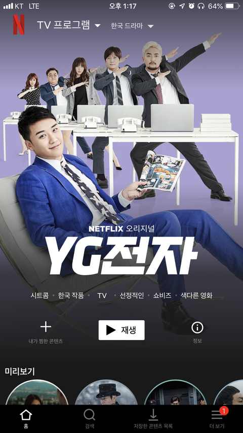 넷플릭스 한국드라마탭 아직도 승리주연 YG전자가 대문짝만하게 메인임
