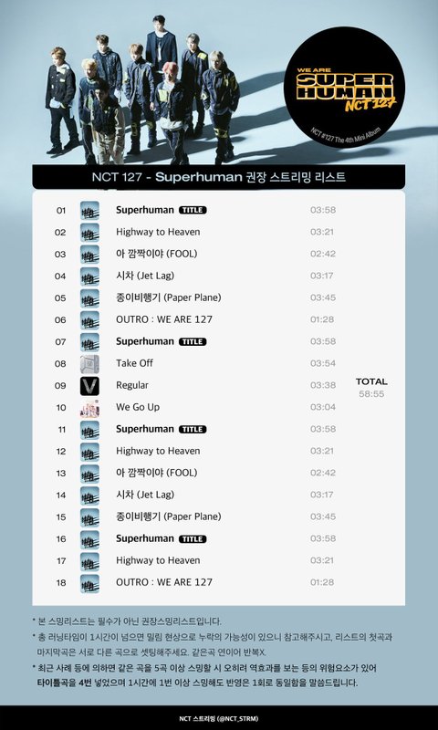 짹 스밍계에서 현재 스밍리스트에서 3곡을 Fireflies로 바꿔서 스밍하면 된다고 해서 제일 최근 슈퍼휴먼 스밍리스트 첨부했어!