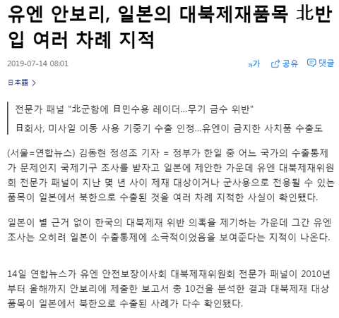 UN 안보리 "일본, 북한에 군사물품 팔아" 논란
