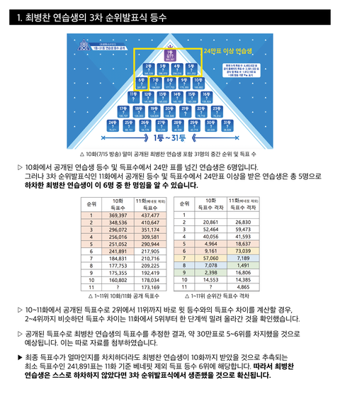 진짜 데뷔각이었는데... 분량 역대급으로 없는데 6위안에 든거 만으로 레전드에 인기 계속 떡상중이라 100퍼 데뷔였을거 같아서 너무 안타깝다... 데뷔 2주도 안남았는데 병찬이는 아파도 어떻게든 버티려 했을텐데 소속사 비리가 확실한듯 ㅠㅠ 병찬이 너무 불쌍해 진짜...