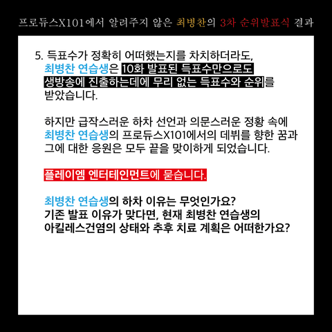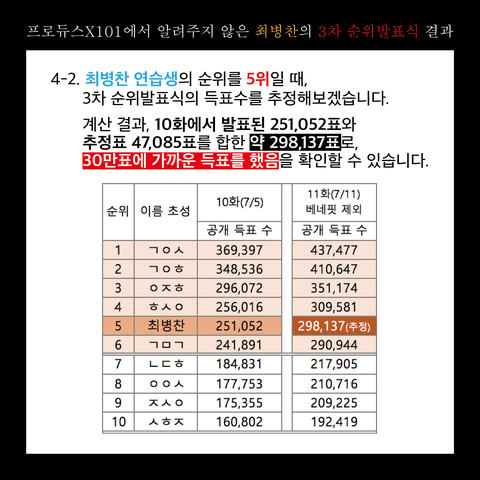 나 진짜 최병찬 팬 아닌데 순위는 알려줬어야 하는거 아니냐 ㅋㅋㅋㅋ 그 기간동안 지인 아이디 다 끌어모아서 투표한 팬들은 뭐가 되는데?