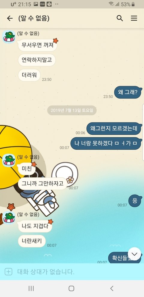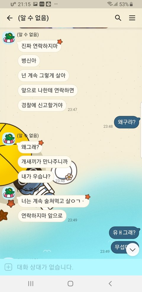 3. 지난주 금요일 회사 부하직원들과 회식을 했습니다. 몇일전부터 여친에게 알려주었습니다. 그리고 여친에게 오후 9시 40분쯤 씻고 잔다고 즐겁게 놀라고 카톡을 받았는데, 두시간후 전화가 와서 쌍욕을 합니다. 그리고 어디서 먹고있냐고 상호를 데라고 하길래 바로 알려주니까 전화를 끊더니 카톡으로 다시 상욕이 남무합니다(이미지 참조)