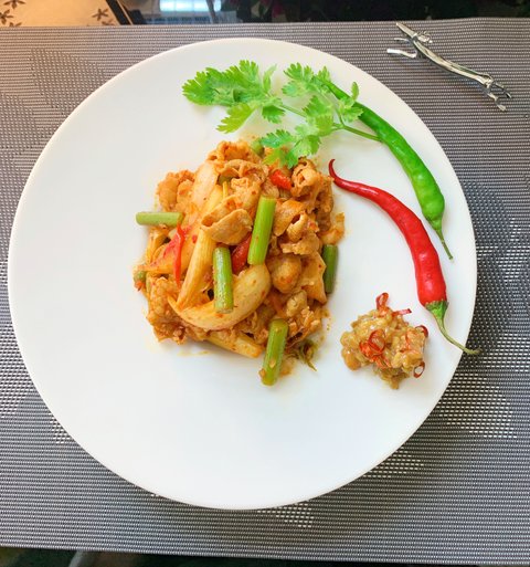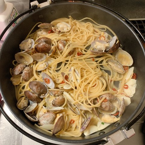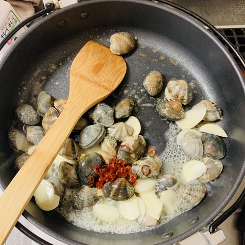 바지락과 칠리, 슬라이스 마늘을 넣고 열이 오르면 화이트 와인을 붓고 뚜껑을 닫아 찌고 바지락이 벌어지면