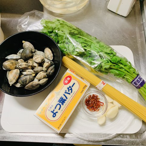 재료 : 해감 많이한 바지락, 고수, 버터, 파스타, 칠리, 마늘