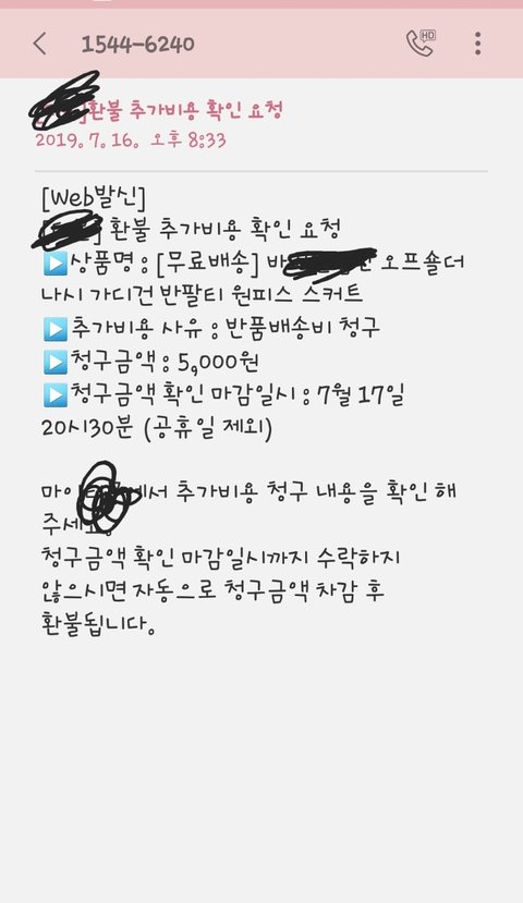 그러나 며칠 뒤 환불배송비5000원을 지불하라는 문자가 와서 티*이라는 소설커머스 업체에 전화를 했는데