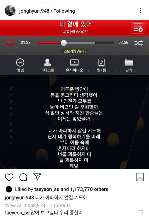 예전 종현 인스타 게시물에 오늘 ( 07월17일 )댓글 남긴 소녀시대 태연
