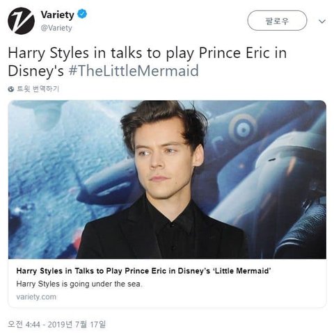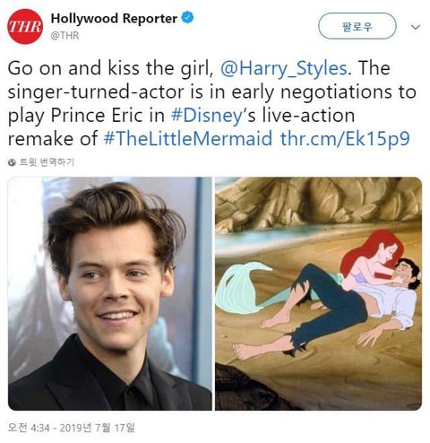 인어공주 에릭왕자역으로 협상 중이라는 해리 스타일스