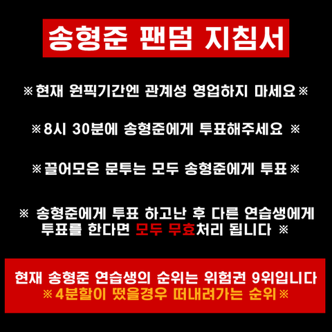 형준이 이번에 프듀에서 데뷔 못하면 답도 없어 5년 동안 애 활동하는 거 볼래? 아니면 떨어지고 -더 성장한 송형준으로 돌아오겠습니다- 이런 멘트 적힌 손편지를 마지막으로 스타쉽 지하 연습실에 수납당하는 거 볼래? 우리 애 프듀 나오려고 이도 갈고 나왔어