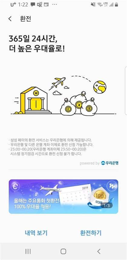 여기에 우리은행 계좌까지 만들어서 여행자보험도 드는거면 잘한거 맞죠?ㅎㅎ참고로 밑에 삼성페이에서 메뉴 -환전 들어가서 했어요!