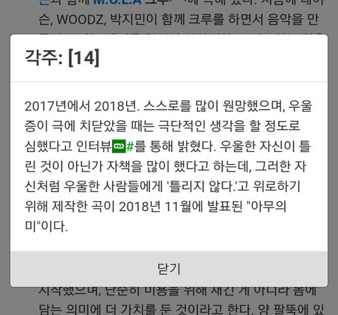 나무위키를 보니까. “2017년에서 2018년. 스스로를 많이 원망했으며, 우울증이 극에 치닫았을 때는 극단적인 생각을 할 정도로 심했다고 인터뷰#를 통해 밝혔다. 우울한 자신이 틀린 것이 아닌가 자책을 많이 했다고 하는데, 그러한 자신처럼 우울한 사람들에게 '틀리지 않다.'고 위로하기 위해 제작한 곡이 2018년 11월에 발표된 "아무의미"이다.” 라는 주석이 있었어.
