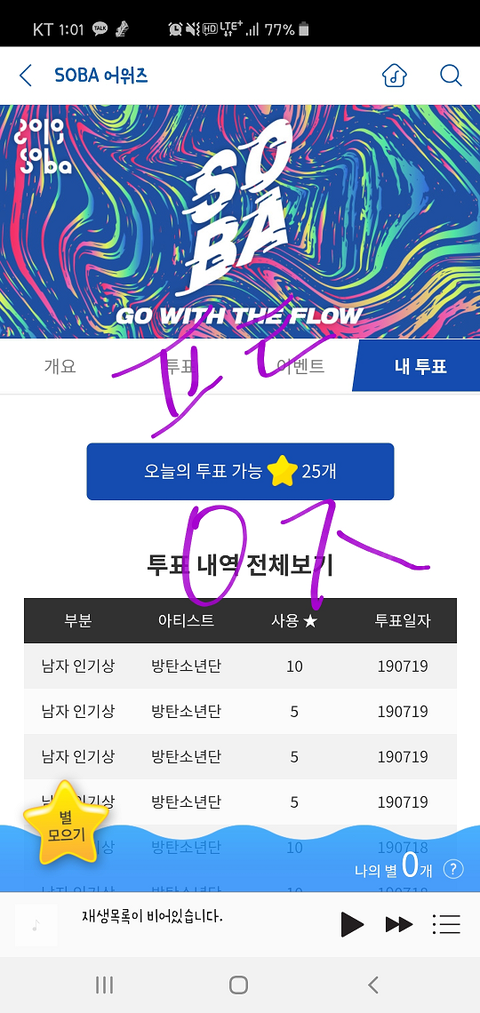 나도 다소 늦게 투표했지만.지금 차이 줄어드는거 보이는데~ 진짜 다들 조금만 더 !! 노력하면 우리 소바에서 인기상 선물해줄 수 있지 않을까?1시 별 줍줍하고 투표하고! 조금만 더 노력해보자 우리!!!