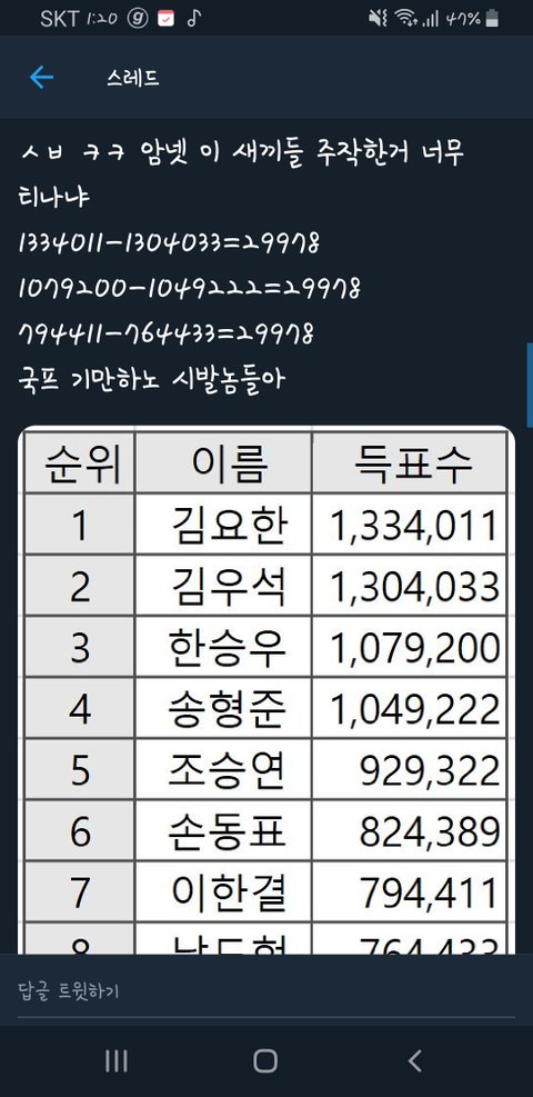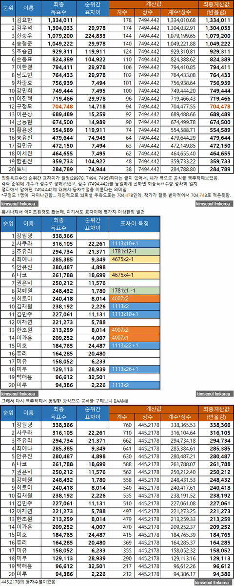 조작이야?? 투표수 차이가 다똑같네..같은색끼리..저렇게 비슷할 수가 있나..? 진짜 궁금해서