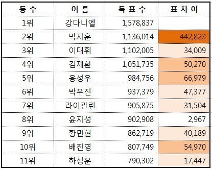 강다니엘 박지훈과 비슷한 득표수?