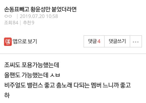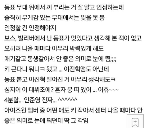 어때? 좀 심하다고 생각하지 않아? 이제 그만 할때도 되지 않았어? 애 불쌍하지도 않냐ㅋㅋㅋㅋㅋㅋ 프듀x할때도 욕먹어 끝나서 데뷔해도 욕먹어 동표가 이런 악플때문에 그 누구보다 상처받고있고 힘들어하는건 알기나 해? 실제로 면전 앞에서 이 말 해보라 하면 한마디도 못할거면서 꼭 판에서만 지랄을 하지. 니들이 아무리 동표 욕해봤자 동표는 어차피 데뷔하고 다같이 꽃길 걸을거니까 그만 발악해