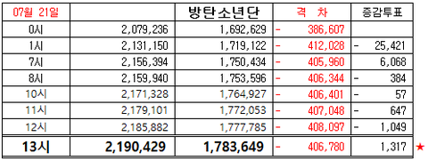 7/21 일요일 1:00 PM 인기상 격차 그래프