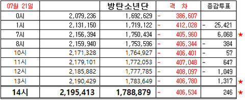 7/21 일요일 2:00 PM 인기상 격차 그래프