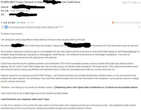 * 아래는 제가 폭스바겐 본사에 보낸 메일 내용입니다.