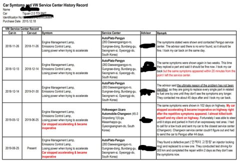 안녕하세요. 저는 2015년 12월에 티구안 2.0 TDI BMT 모델 구입하여 현재까지 약 7만km 정도 주행하였습니다. 제 차는 2018년 11월부터 몇 차례 동일 증상의 문제 (총 4번)로 폭스바겐판교서비스센터를 통해 모든 서비스를 받아 왔습니다.