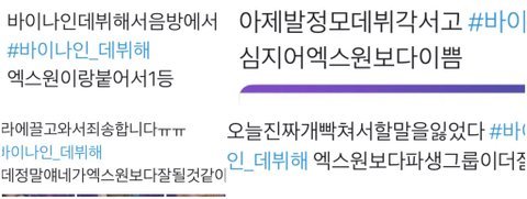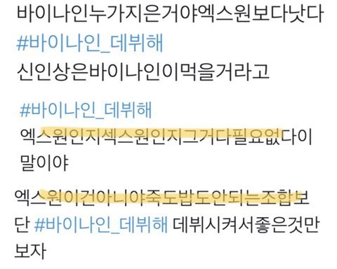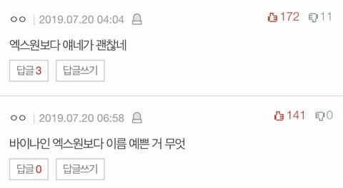 바이나인 . 우리도 우리 애들이랑 같이 연습하던 친구들 떨어지고 너네처럼 의외의 데뷔조가 생겨서 놀란 팬들도 많아. 그래서 파생그룹 생기는 것도 응원하고. 근데 엑스원이랑 이렇게까지 비교하면서 파생그룹을 만들어야 하는 이유가 뭔데? 데뷔 멤버 나오자마자 온갖 포털사이트 댓글에 바이나인 vs 엑스원 해놓고 추반하고 ㅋㅋㅋㅋㅋ 너넨 정말 이게 맞다고 생각하는거야?