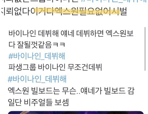 애들 까는거 바이나인 팬이라고 단정 안해 . 엑스원 팬들중에서도 같은 멤버 까는 팬들 많으니까