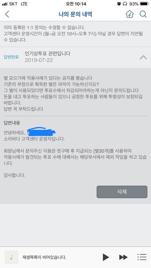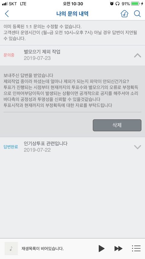 소리sea에 답변을 받았는데 지금 제외작업 중이라는 답변이 왔어 그래서 투표시작부터 현재까지의 부정획득에 대한 자료를 요청해놨어