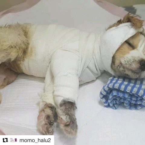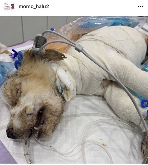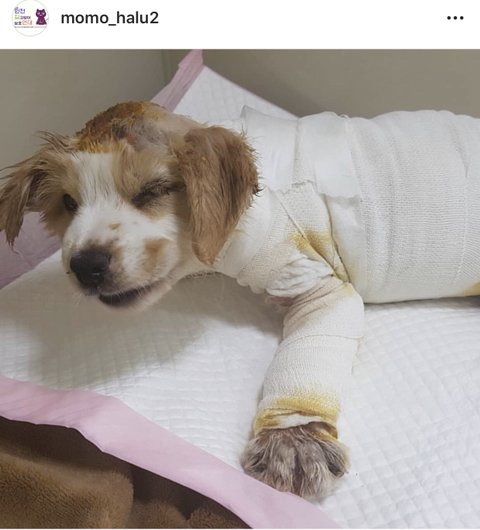 2. 다음날, 눈에 실핏줄이 터지며 쇼크가 옴. 시보호소 위탁병원에 데려가서 산소방 들어가 수액과 영양제로 응급처치. (담뱃불에 지져지고 한쪽 눈은 안구함몰, 타박상 등의 상처는 있었지만 가장 심각한 전신화상은 털에 가려져 몰랐음)