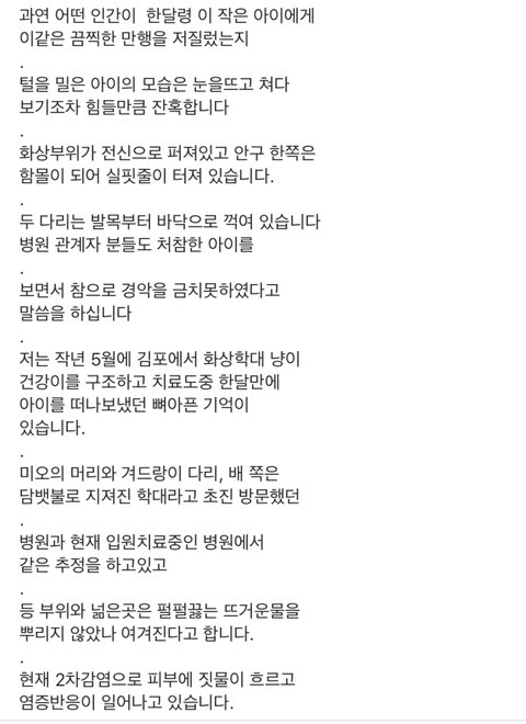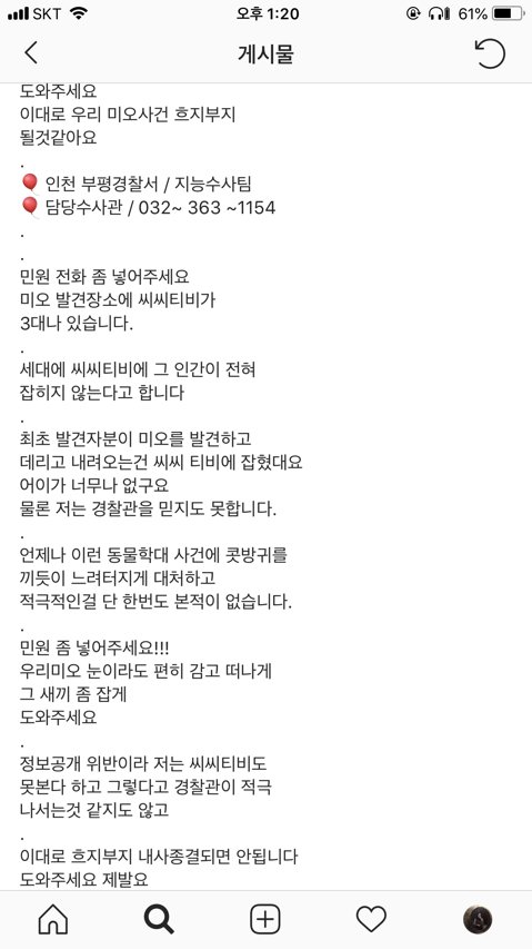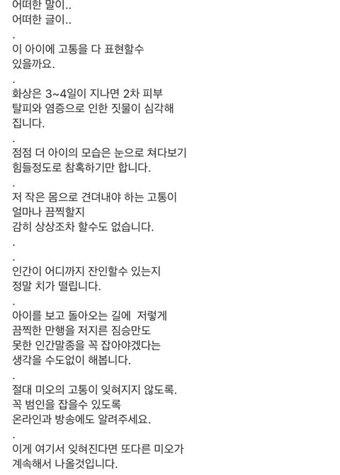 지금 유야무야 넘어가면 악마에쿠스 사건처럼 같은 일이 계속 반복됩니다. 잔인하게 생명을 학대해놓고 벌금 몇십 혹은 아무런 처벌도 없이 풀려나 같은 일을 저지릅니다. 지금도 고통 받고 있을 생명을 위해 힘을 모아주세요. 근처에 CCTV가 3대나 있어 구조자님은 찍혔지만 범인의 모습이 찍히지 않았다고 합니다. 경찰의 적극적인 수사와 대처가 필요하지만 제대로 되지않고있어 미오 사건이 흐지부지 될 것 같습니다. 국민신문고에 민원 넣어주시길 부탁드립니다.