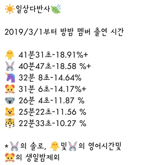 발단은 김캐형 개인팬의 글. 방밤에 등장하는 멤버들의 분량 수치를 계산한 글이 올라옴.
