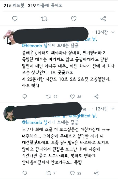 어떤 방밤에서는 남준이 목소리만 나오고 몇초만 나옴. 윤기 1초컷. 김태형 1초컷. 제정신? 작작 해라 지민악개들아. 똑같은 분량 회서에 원하는 팬들이 김태형팬일것만 같냐? 윤기나 남준이 팬들 똑같은 심정일텐데. 나만 해도 남준이가 분량 오지게 적어서 속상함. 리더다 보니 비중도 꽤 있고 임팩트 넘치지만 분.량.이 너.무 차.이.나.잖.아