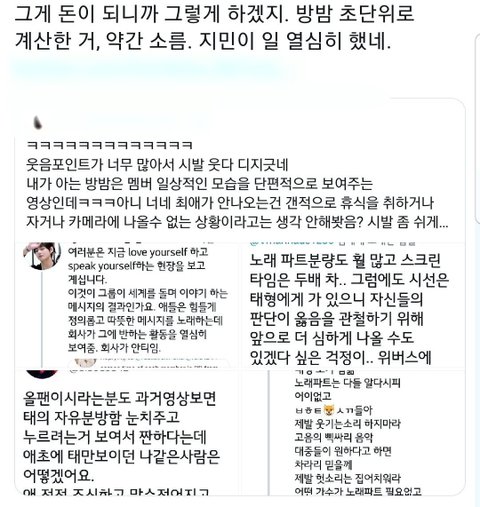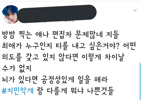 문제는 요고. 누가 최애인지 알겠다며 비꼬았고, 지민악개와 빅힛을 비교해 글을 적음.ㅋㅋㅋㅋㅋㅋㅋㅋㅋㅋ 누구 최애인지라는 구절만 빼면 쉴드는 쳐줄텐데.(감정이 너무 쏠린듯) 방밤 제작진들이 악감정을 갖고 의도적으로 편집을 했을거라며 멋대로 추정함.