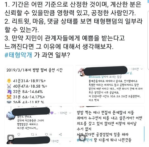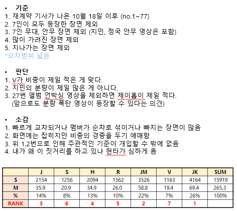 1. 원글쓴이는 방밤 분량 3월-현재 분석을 통해 분량이 가장 적은 지 최애 분량좀 늘려달라고 빅힛에 요구하고 싶었음