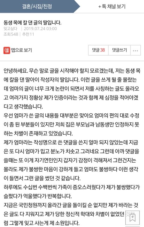 이건 주작 100%입니다 1. 진짜 딸이면 하고싶은 이야기도 많을텐데 마지막에 ㅇㅈㅇ은 아니에요한게 아니라 다짜고짜 글 맨위에서부터 일단 ㅇㅈㅇ은 제 동생이 아닙니다 부터 나옴 2. 참담(식칼댄 딸아이 원글작성자, 사건의 어머니)가 쓴 추가글에 딸아이는 핸드폰번호를 바꾸고 친구전화로 연락이 왔었다고했음 번호 바꾸고 카톡 등록하면 이전 카톡 싹 다 사라짐 3. 딸이라고 주장한 'ㅇㅇㅇ'씨는 본인이 딸임을 주장하는 내용과 그간의 고통을 토로하였고 조선영으로 달린 댓글은 자기 친구가 아니라는 댓글을 담 하지만 이 글에서는 또다시 조씨는 자신의 친구가 단 댓글이 맞다 라고 하고있음 4. 진짜 딸이 쓴 글이라면 "동생 목에 칼 댄 딸입니다"라는 식으로 글을 쓰진 않았을 것이라는 일반적인 생각. 이러한 부분으로 비추어볼때 이 글은 딸의 어머니가 작성한 것으로 보입니다 5. 이 글은 나중에 아들놈 신상 ㅇㅈㅇ에 대한 댓글이 달리자 삭튀함