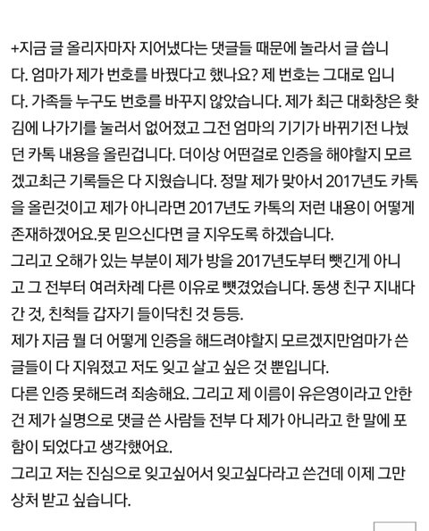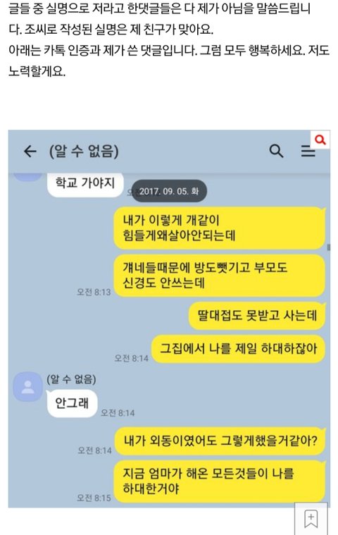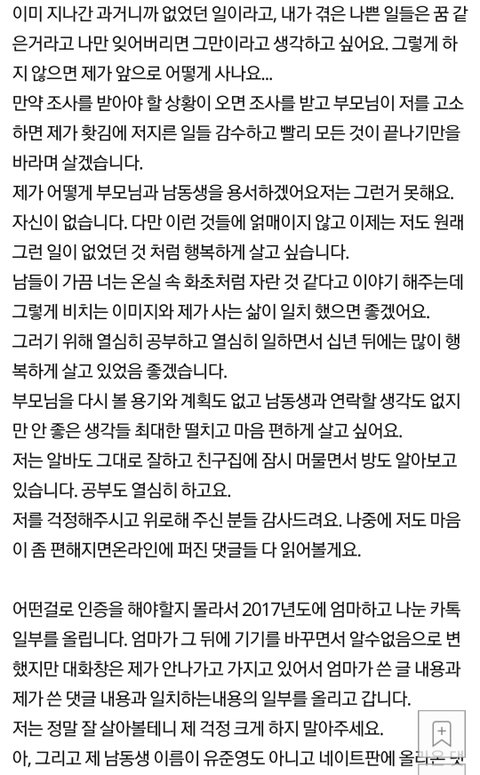 딸인 척 주작한 글이 확실히 주작이라는게 뭐냐면 진짜 딸인 유은영 닉네임으로 감정 배제하고 쓴 댓글에는 동생을 유ㅈㅇ 이라고 애정없이 풀네임으로 부르는데 ㅋㅋㅋㅋ 조민영 엄마 사칭한 유은영 글들은 상냥하게 동생 이라고 부름 ㅋㅋㅋㅋㅋㅋㅋㅋ 누가 봐도 애미년이 주작한 글 ㅋㅋㅋㅋㅋㅋㅋㅋ