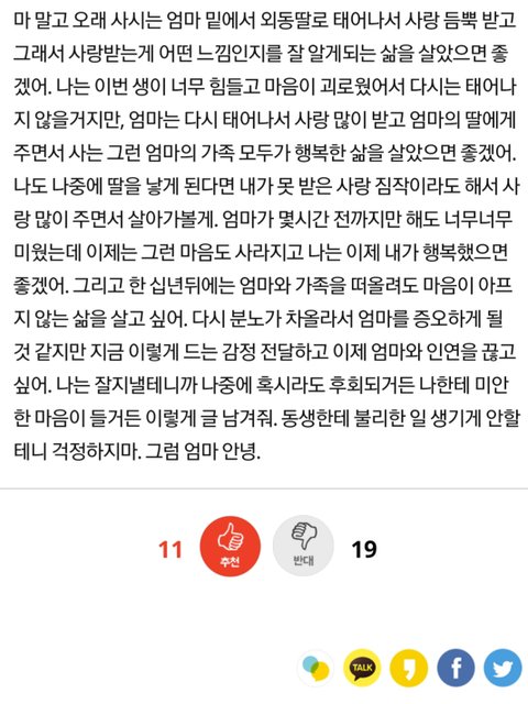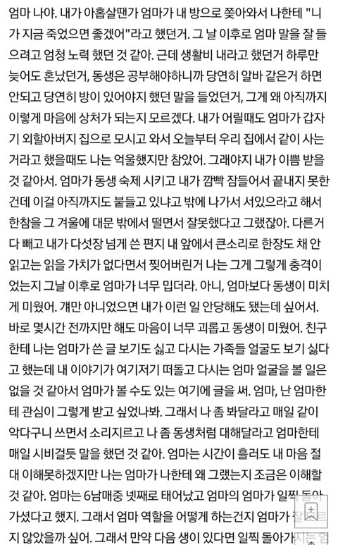 진심 어이없었던게 ㅋㅋㅋ 여남차별에 빡쳐서 차 부수고 나온 사람이 자기가 남들 눈에 온실 속 화초처럼 보였으면 좋겠다고? 게다가 제일 적극적으로 차별행위에 동참한 엄마한테 집 나온지 하루만에 다음 생엔 행복했으면 좋겠단 얘길 한다고? 개소리가 아닐 수 없음