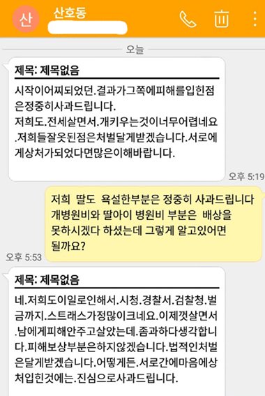 그쪽에선 처음엔 미안하게 됐다 사과를 하는 듯하더니, 뭘 원하냐, 뭐 요구 사항이 있을 것 아니냐 하는 말에 어머니께서 직접적으로 피해를 입은 딸에게 사과를 하고, 강아지와 저의 병원비를 전액 보상해 달라 하시자(영수증을 전부 모아 뒀습니다. 총 약 38만 원 가량) 그렇게는 못하겠다, 나도 그쪽 딸에게 대한민국 욕이란 욕은 다 들었다. 사과 할 수 없다. 병원비도 내 줄 수 없다. 고소해라 벌금 맞겠다. 우리 집도 구청에서 사람도 나오고 경찰서에서 연락오고 손해 본 게 많다며 불쾌 해 했고, 그럼 강아지가 다친 부분도, 아이가 맞은 부분도 보상 할 수 없다고 말 하는거냐 묻자 일방적으로 전화를 끊어버리기에 그 이상의 대화가 불가능 했습니다.