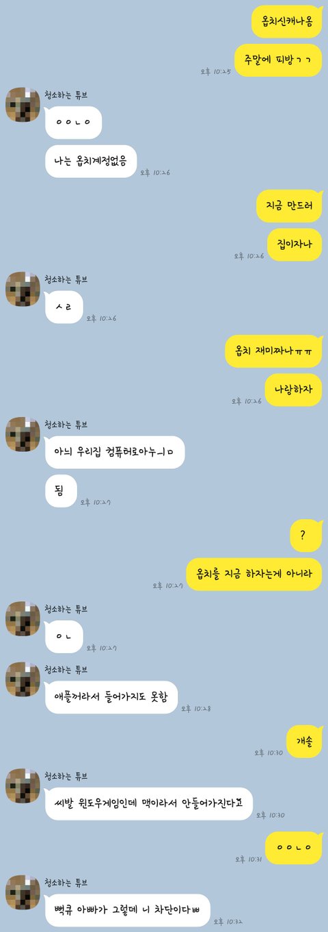 근데 갑자기 저거 가지고 차단한다고하면서 뻐큐거리고 난 당황해서 그냥 ㅇ 보냈는데 다음날(오늘) 보니까 카톡부터 페메,페북까지 다 차단했더라고 나 얘랑 모배도 같이하는데 모배도 내가 메세지 보내는거 무시함