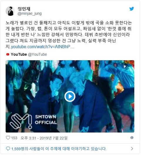 노래가 별로인 건 둘째치고 아직도 이렇게 밖에 곡을 소화 못한다는 게 놀랍다.