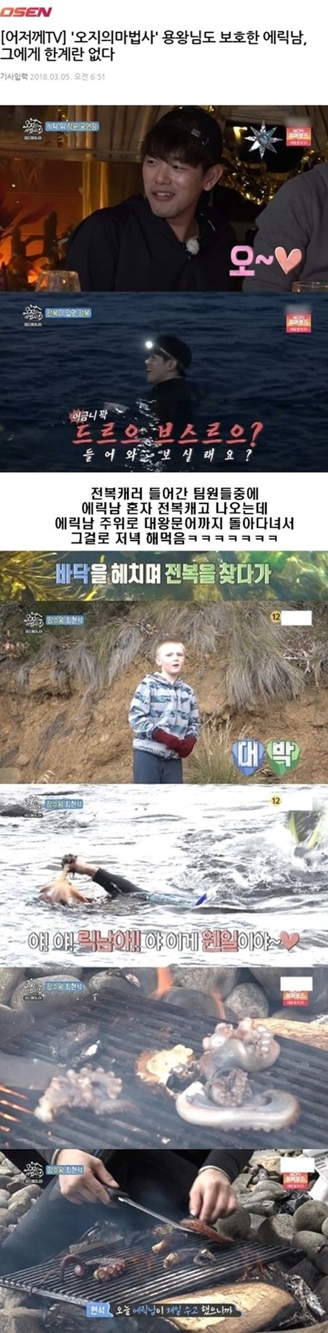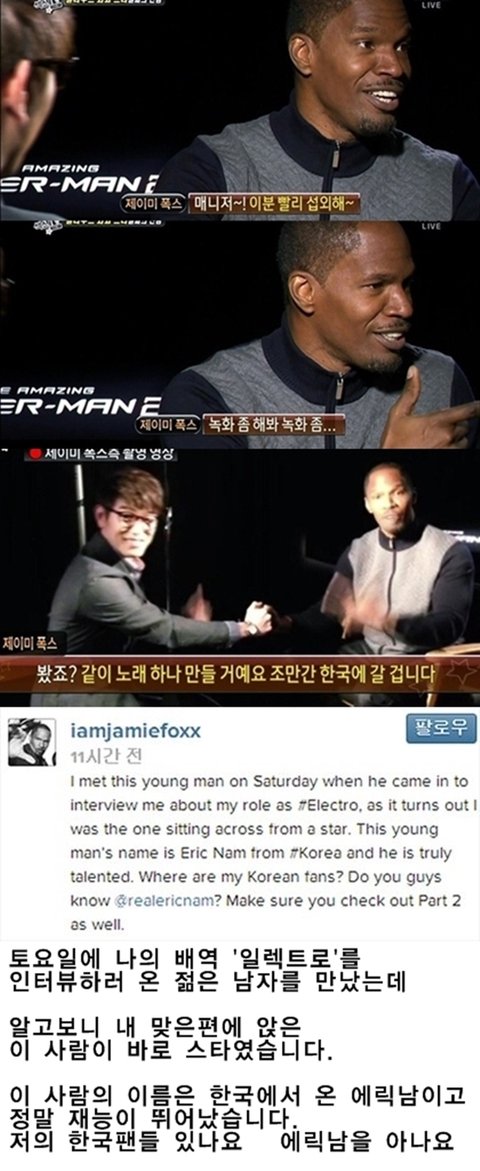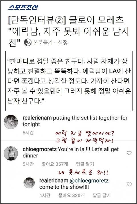 쭉보다보니 이거없네. 이게 더 발리는게 김신영이랑 같이 리포터했던 황제성이 말한거란거ㅋ 에릭남은 이걸 말해도 되냐는거면서 꺼려함. 바바라팔빈이 경호원이 말려도 에릭남 번호 따가서 저녁에 전화해서 놀자 했는데 에릭남은 김신영이 진행하는 라디오 회식 선약땜에 바바라팔빈 거절하고 김신영 회식감 ㅋㅋ 이런남자가 진짜 믿음직 스럽지 세계에서 제일 이쁜 모델을 거절하고 선약 지킨 사람ㅋ 난 회식하는 중이라도 입에 고기 물고 뛰쳐나갔을듯.