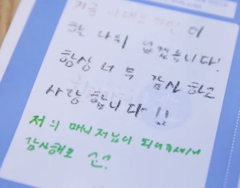 마지막에 매니저 형한테 하고 싶은말 쓰는거였는데 글씨체마저 사랑스러움 ㅋㅋㅋㅋ