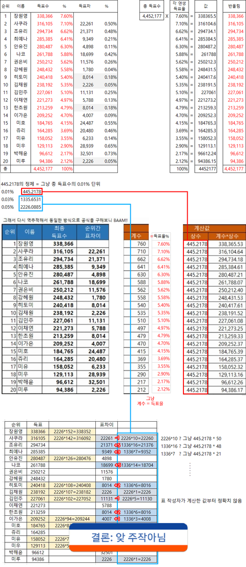 상수(445.2177) * { 각 연생의 득표율차 (장원영-사쿠라의 경우 7.60-7.10 = 0.50) * 100 = 계수} 로 계산.