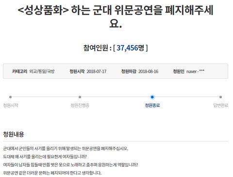나 이 청원 4만명도 못채우고 마감된게 진짜 기분 안좋음.... 진짜 글처럼 군인들을 위문한다는거 자체가 지금 2019년 군대랑은 맞지도 않고, 지금 여성인권에 다들 엄청 신경쓰는 사회분위기에서 위문공연에 꼭 젊은 여자가수나 섹시댄스팀만 나와서 헐벗고 선정적인 춤을 추고 하는건ㅋㅋㅋ 여성인권을 챙기기는커녕 오히려 여성을 성적대상화,성상품화하는 것밖에 안되잖아. 난 그런게 무슨 위문인가 싶음. 남자들은 그런걸로밖에 위로를 못받나?