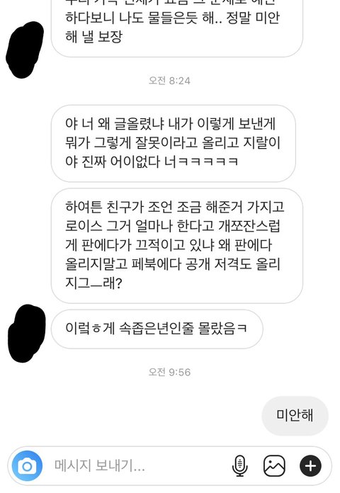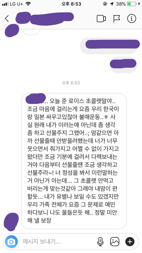 내가 생각못하고 준 선물이기도 하지만 굳이 이렇게까지 얘기할일인가 싶다... 물론 쟤 가족들도 예민하게 생각하는 부분이라 본인도 물들었다고 하는데 사실 내가 준 선물 버렸다고도 얘기하는거 읽고 좀 많이 속상해 ㅠㅠ 그냥 그렇다고 내 잘못도 있지만말야...나 뭐라 답장해야할까? 미안하다구 할까 그냥..?