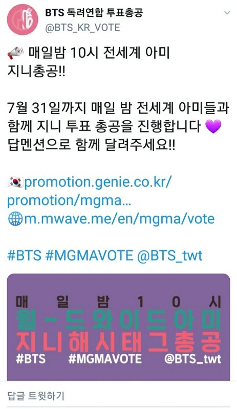 가즈아!!!!!!!! 소바랑 엠티비 툽들도 독려하자 외랑둥이 응원도 하구 ㄱㄱㄱ https://twitter.com/BTS_KR_VOTE/status/1155463156828758017?s=19